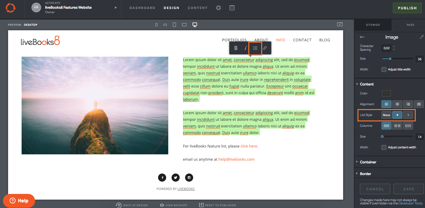 3. Under Content on the righthand side in the design panel, select None next to List Style