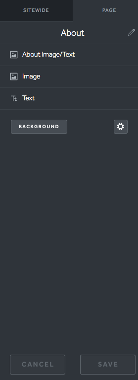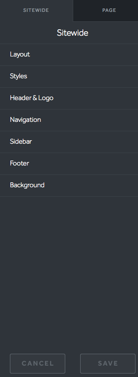Sitewide contains the controls and settings that affect all the pages on your website. This includes themes, layout, overall style, header, navigation, and footer.