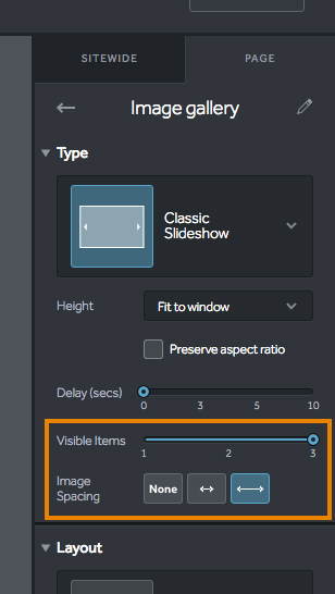 5. Then look for the Visible Items slider below and choose 1 to 3 images visible per slide. You will also see the Image Spacing area where you can add or remove spacing between the visible items.