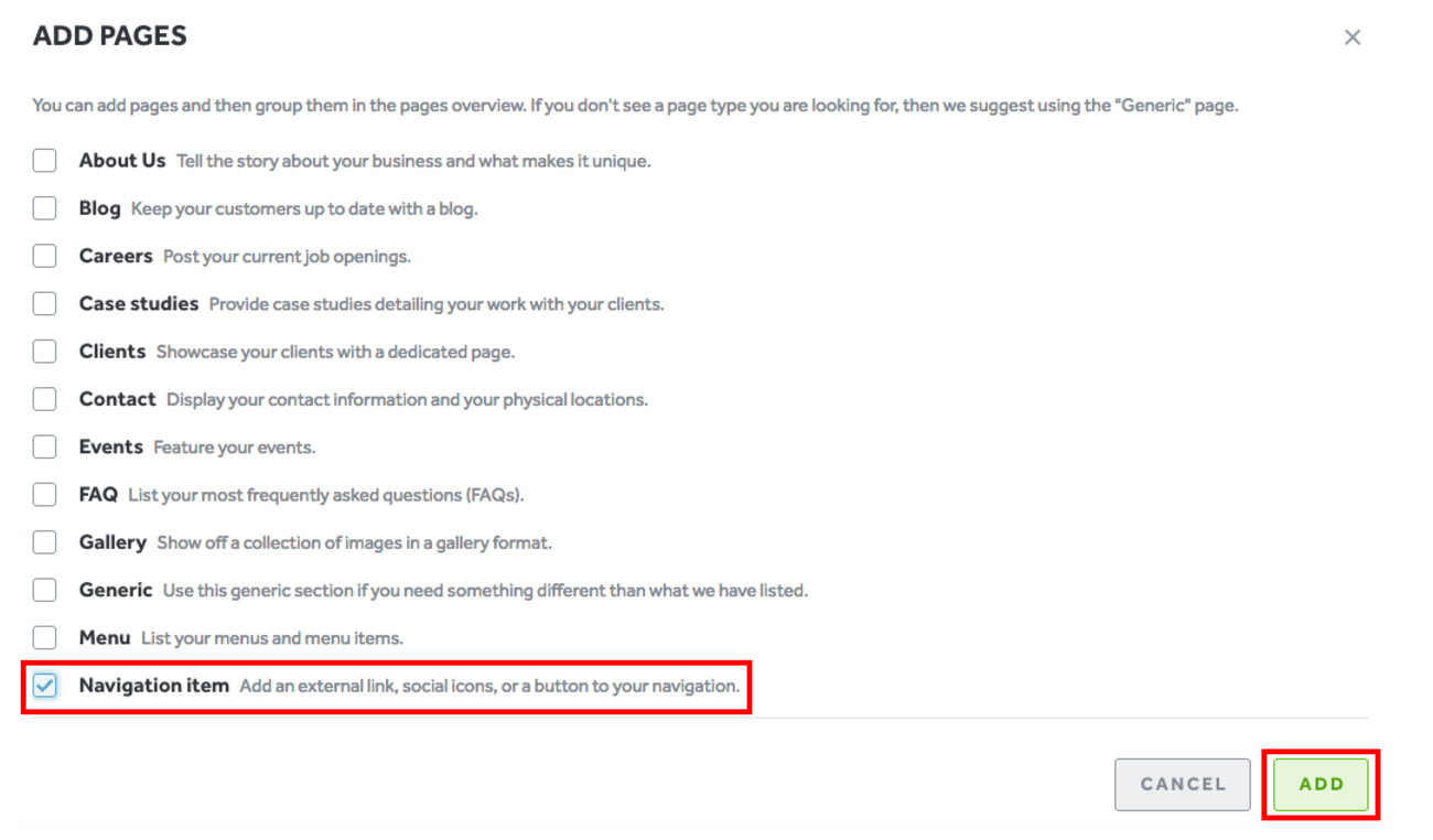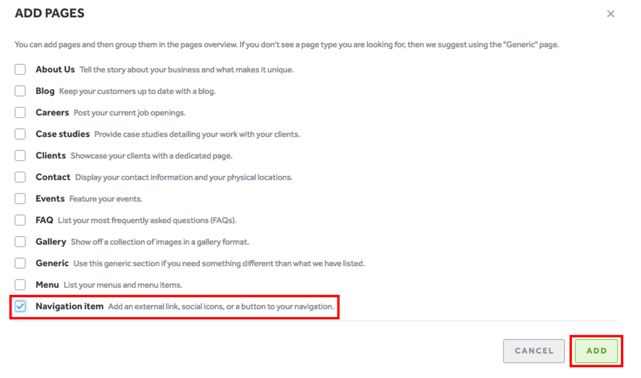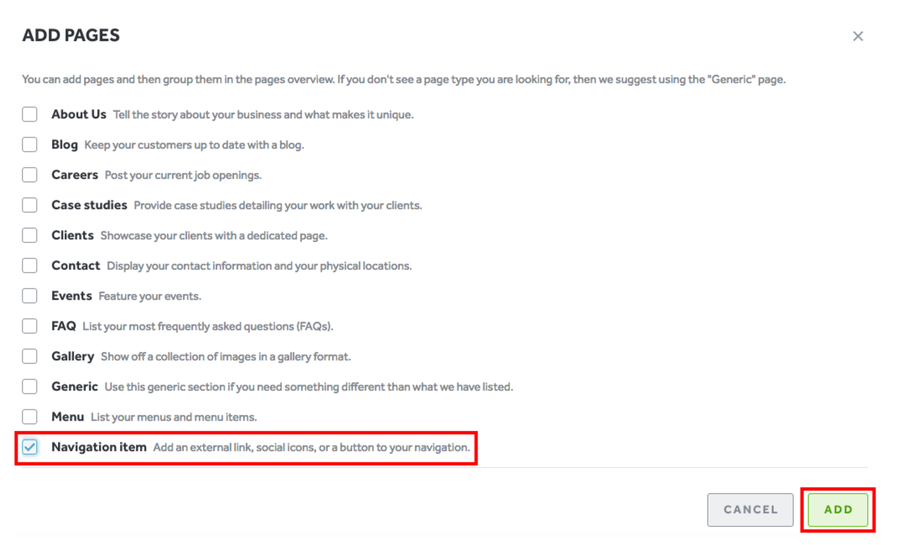 - Check the box next to “Navigation Item” and then select “Add”