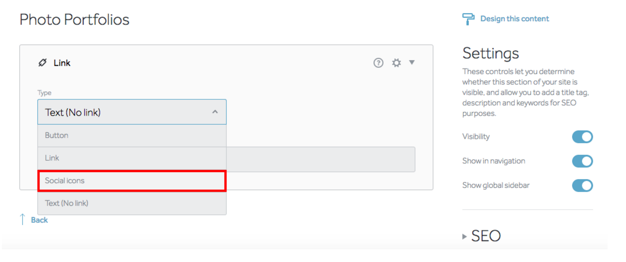 - From the drop-down, select “Social Icons.