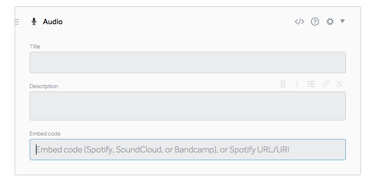Audio blocks are a great way to display music files and podcasts. To add audio into the blocks, you will need to get the embed codes or URLs from your audio source.