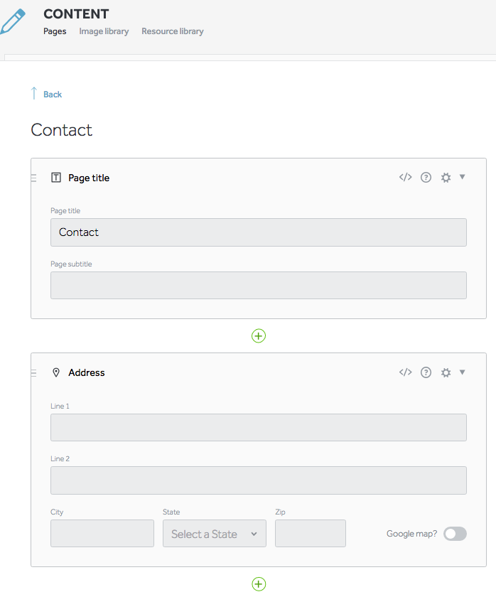 3. If you are needing to add a map to your already existing contact page, select the green + button on the page, then select Address