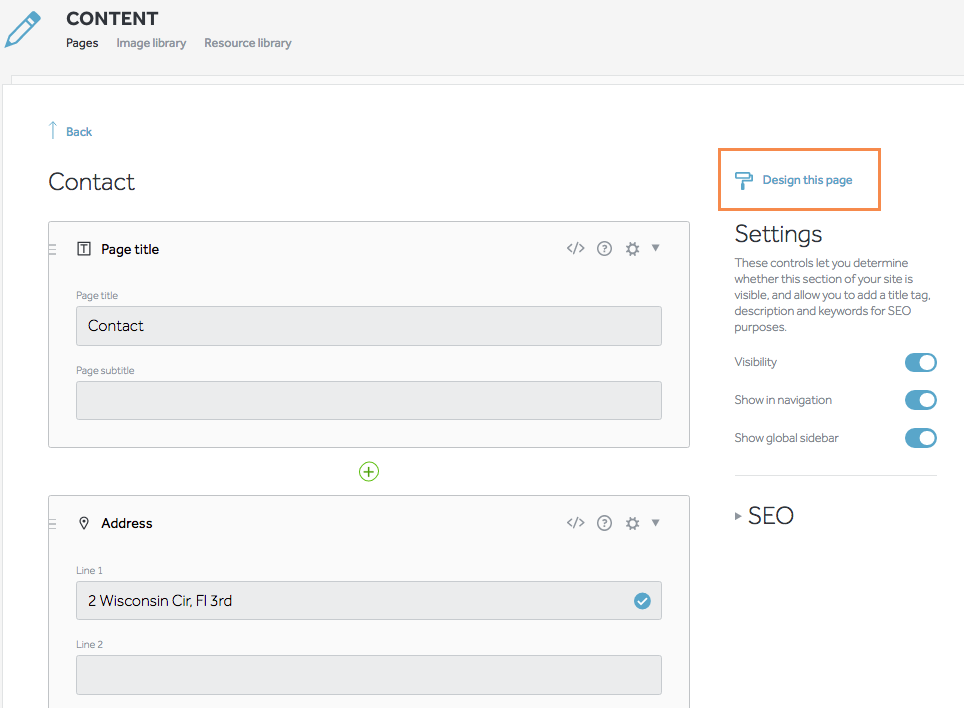 5. To take this another step further, you may want to make the map interactive (zoom and pan functions). Go to the Design panel from the Contact page in Content by selecting Design this page
