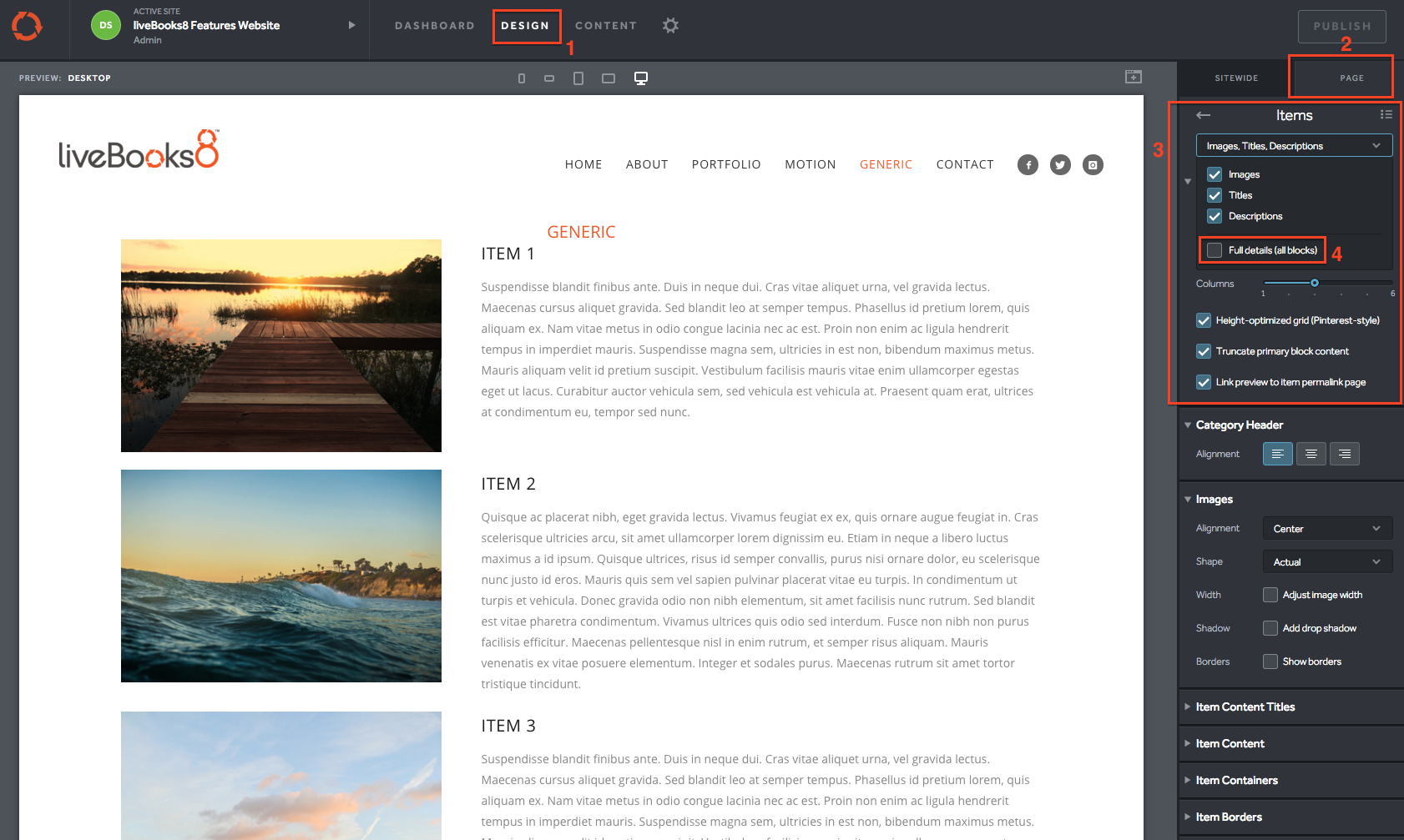 1. Go to Design on the gray navigation bar. Locate and go into the Page you’d like to edit the Items list from.