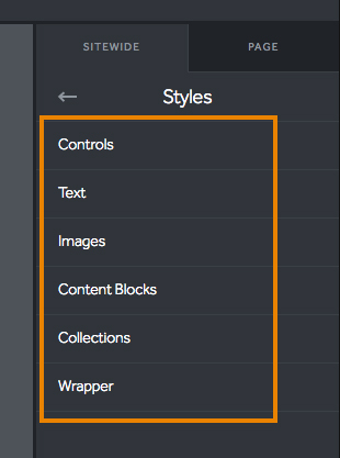 2. In Styles, you will see different elements of your site listed. This is where you establish default style settings for different elements.