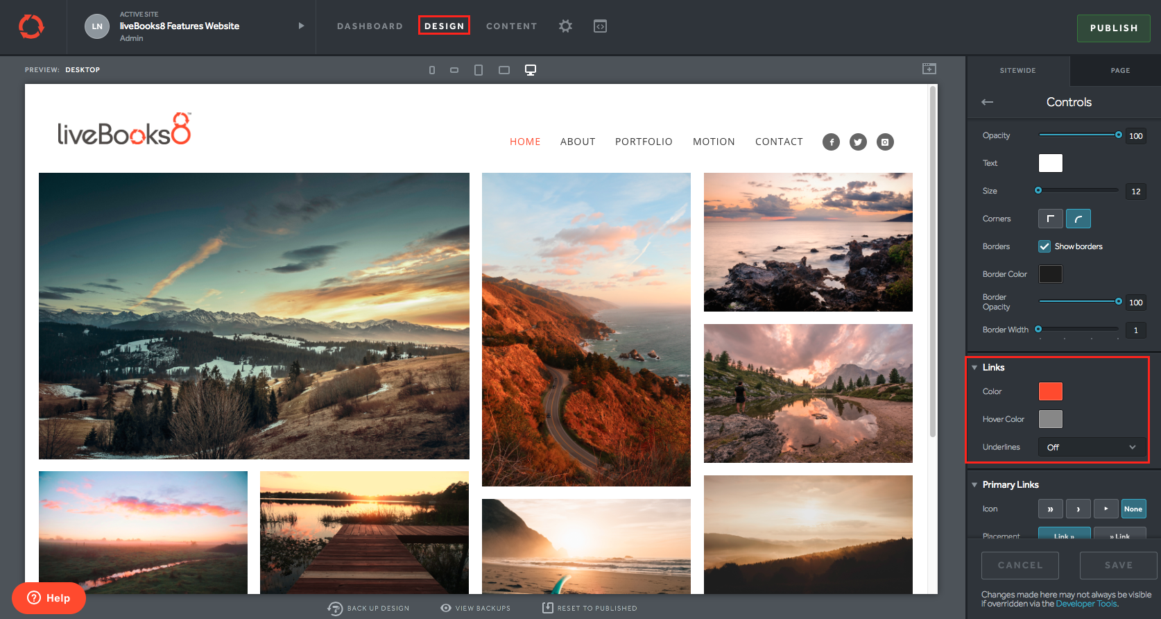 3. Scroll down until you see Links. Make your Color and Hover Color choices and turn Underlines Off, On, or Hover only.