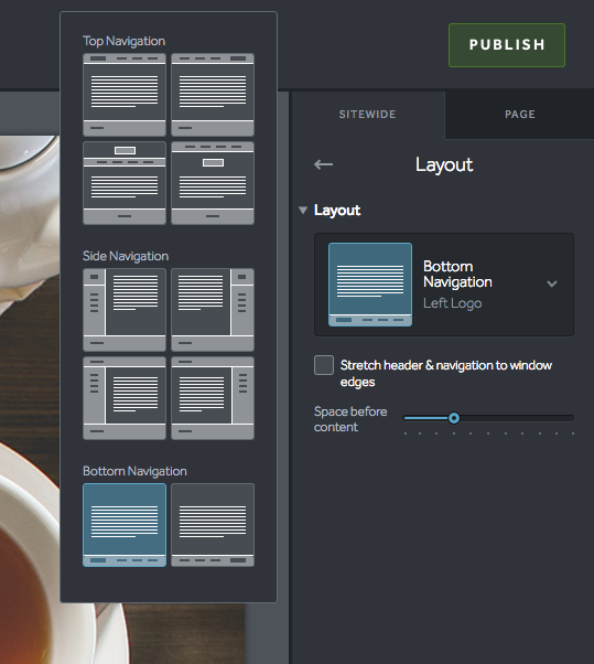 When you select a bottom navigation layout within the Design panel, the mobile footer will not display. You may make design changes to the mobile footer but they will not be made visible as the mobile footer is disabled. The desktop footer will still display it's content.