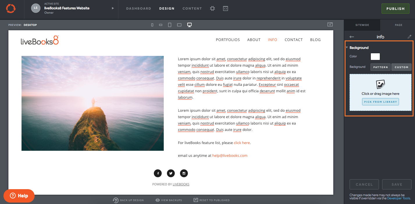 2. Select the Page tab in the right-hand menu of the Design panel and select the Background button at the bottom of the page information.