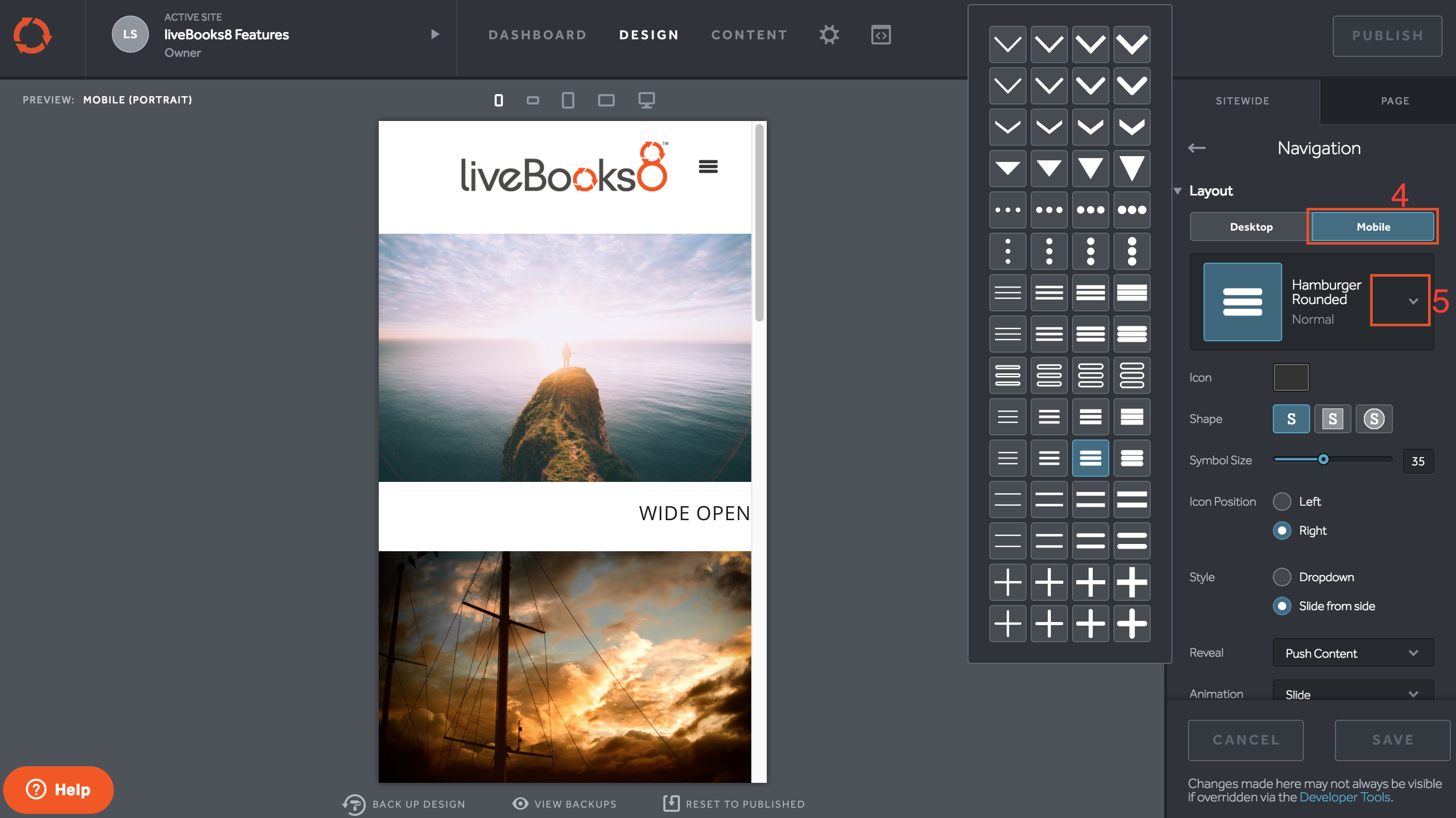We offer many options for you to customize your site's mobile navigation. Out of the box, your site comes with styling chosen for your mobile navigation that will match the design you picked. You will find all customization options for your navigation within the Design tool: