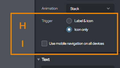 (H) Trigger -The trigger option is only seen when you choose the Dropdown feature under Style (E). Choose how your navigation menu is made visible with this option. Label & icon - Include the first navigation item's title with your icon on the side, the styled expandable menu displays beneath. Icon only - Show only the icon. |