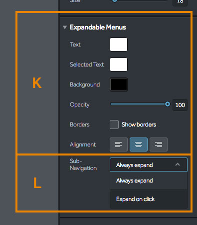 | (K) The design settings made here are for your navigation menu if you enable a navigation menu that appears on a click action. |