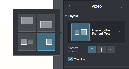 4. You will immediately see layout options to position your text around the video. You can position the content how you would like (top/center/bottom for text next to video) and also wrap the text around the video.