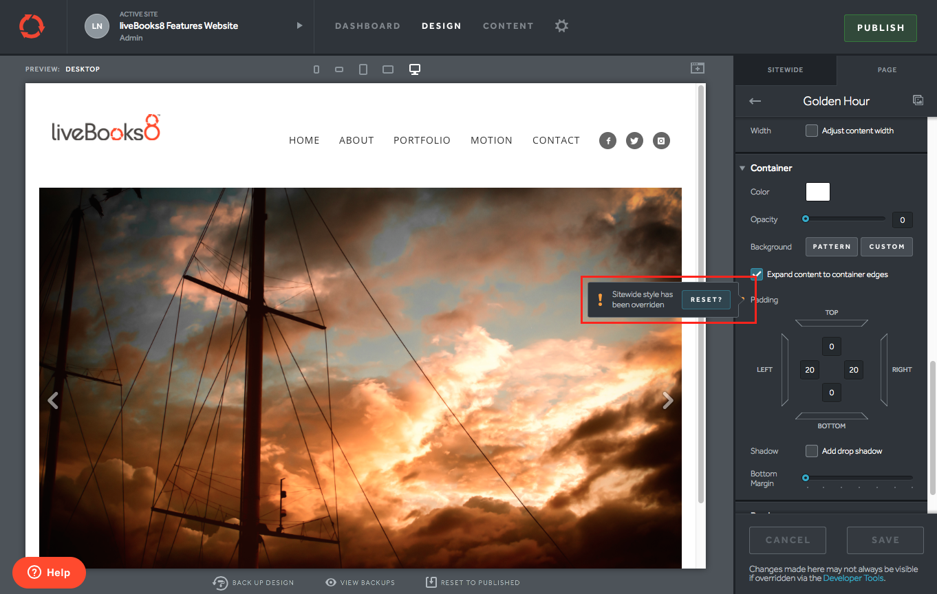 You may change the Sitewide settings for most values on any specific page within the Design tool. An orange dot next to any setting indicates that you have overridden the sitewide setting; you may reset any customized value to its original value by selecting the Reset button.