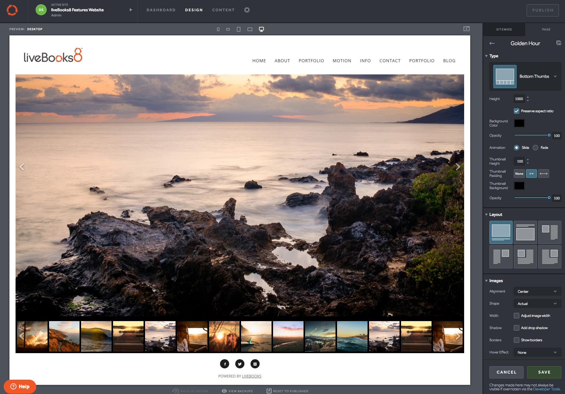 We have several gallery options that have thumbnail menus for all liveBooks websites. Thumbnails allow your viewers to quickly preview your images before viewing the enlarged version, all on one page.