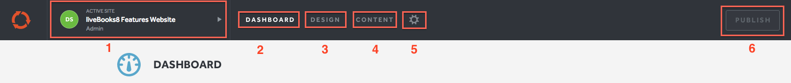 1. By selecting this section, it will allow you to switch between multiple sites on your account, create a new site, manage your liveBooks account, or logout. "Active Site" will display the current site you are managing through the Dashboard.